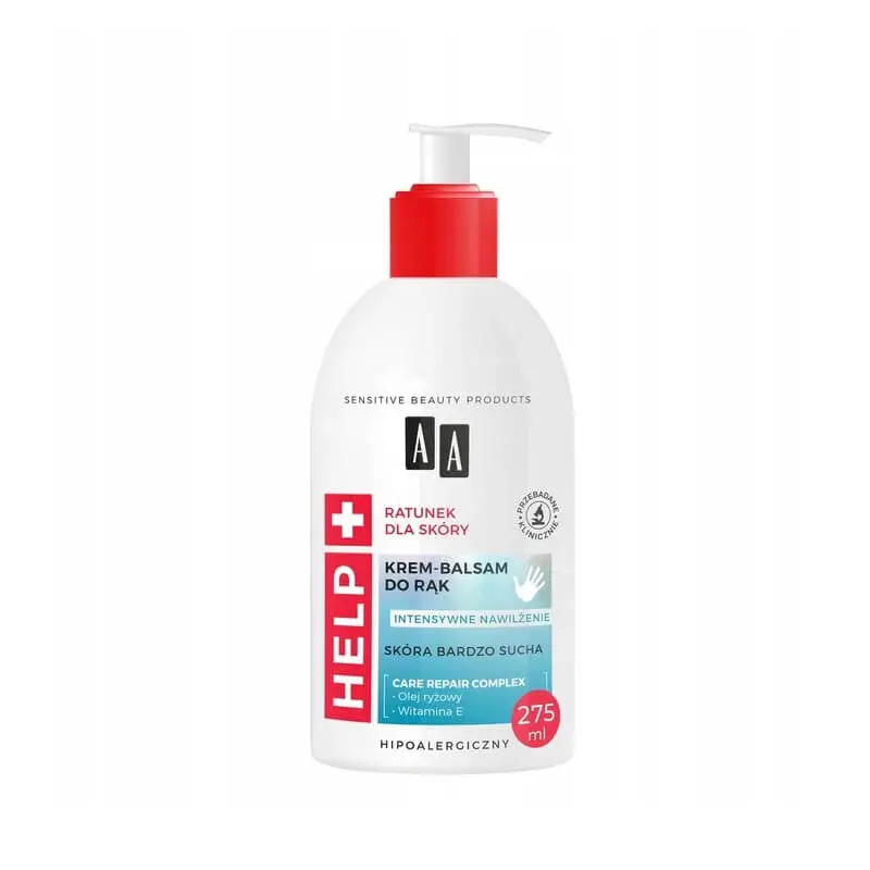AA Help to krem do rąk z bardzo suchą skórą w formie balsamu. Posiada recepturę składającą się z masła shea, CARE REPAIR COMPLEX, jak również Ceramidów III generacji. Takie zestawienie zapewnia dogłębne nawilżenie skóry dłoni, którym towarzyszy szorstkość. Co więcej, wspiera odbudowę warstwy lipidowej na skórze, dzięki czemu zapobiega przed nadmierną utratą wody, czego wynikiem jest sucha skóra, jak i mikrourazy naskórka. Kosmetyk doskonale sprawdzi się do codziennej pielęgnacji dłoni. Dedykowany jest szczególnie dla skóry wrażliwej, która podatna jest na przesuszenia i pęknięcia. Dodajmy, że po nałożeniu na skórę intensywnie odżywia ręce oraz przyspiesza regenerację naskórka.