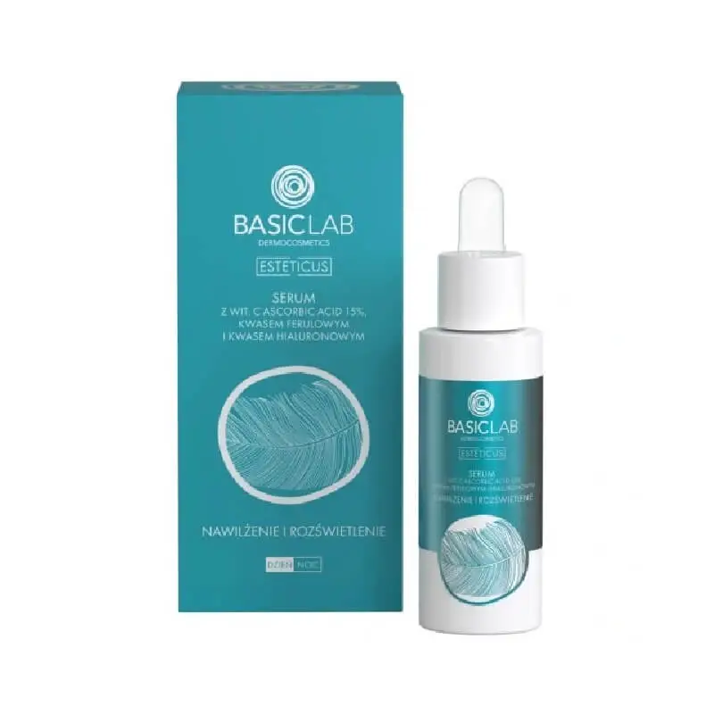 Serum do twarzy BasicLab Esteticus w opakowaniu w kolorze niebieskim to następne skuteczne serum do twarzy, które wykazuje szerokie działanie na cerę. Warto wspomnieć, że w recepturze produktu znalazły się takie składniki jak: witamina C o stężeniu 15%, kwas ferulowy, kwas hialuronowy, jak również witamina E. Takie zestawienie składników aktywnych zapewnia szerokie działanie na naskórek twarzy. Serum dzięki zawartości witaminy C rozjaśnia skórę oraz nieestetyczne przebarwienia. Na dodatek wykazuje działanie nawilżające, przez obecność kwasu hialuronowego, jak również witaminy E. Ta ostatnia dodatkowo uszczelnia błony komórkowe, dzięki czemu zapobiega przed utratą wody z naskórka. Jest to serum do twarzy, które ma właściwości przeciwzmarszczkowe. Po pierwsze stymuluje fibroblasty do produkcji kolagenu, dzięki czemu następuje redukcja istniejących zmarszczek, jak również zahamowanie procesu starzenia się cery. Na dodatek preparat reguluje wydzielanie sebum oraz zmniejsza widoczność porów. Regularne stosowanie tego kosmetyku zapewnia szybki efekt w postaci wygładzonej, pełnej blasku twarzy.