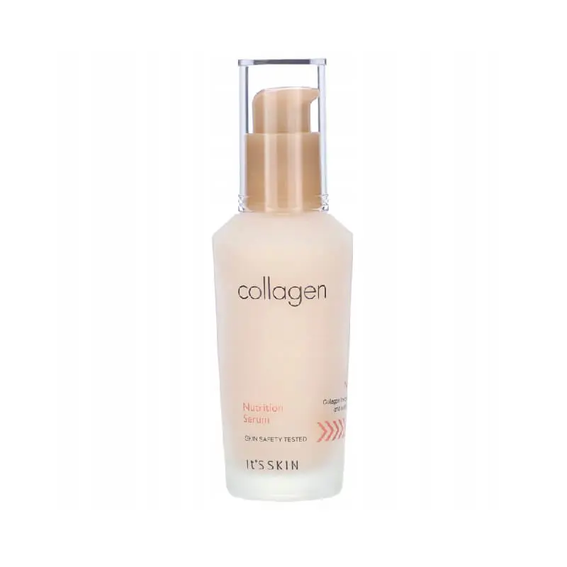 IT’S SKIN Collagen Nutrition Serum to koreańska odpowiedź na potrzeby skóry z widocznymi oznakami zmęczenia i przesuszenia. Prezentowane serum z kolagenem zawiera formułę opartą na hydrolizowanym kolagenie (8000 mg). Tym samym kosmetyk działa jak kompres na skórę – wygładza, zwiększa elastyczność i zatrzymuje wilgoć w głębszych warstwach naskórka. Dzięki temu zmarszczki stają się mniej widoczne, a cera wygląda na bardziej wypoczętą i zregenerowaną. Dodatkowo serum kolagenowe IT’S SKIN Collagen Nutrition wzbogacono o ekstrakty z alg, olejek z mango oraz witaminę E. Takie zestawienie składników wspiera pielęgnację skóry wrażliwej, skłonnej do odwodnienia i pozbawionej blasku. Następnym plusem jest fakt, że kosmetyk szybko się wchłania, nie pozostawia tłustego filmu. Poza tym doskonale współgra z kremem. Kończąc, jest to świetny wybór dla osób, które chcą połączyć efekt odżywienia z działaniem przeciwstarzeniowym.